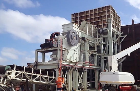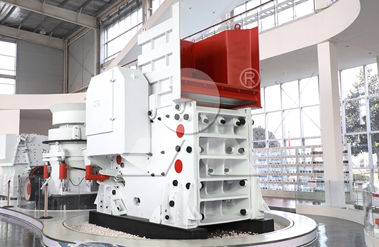 青石進(jìn)入儲(chǔ)物箱后,被振蕩喂料機(jī)均勻地?cái)嚢瑁缓蟊晃谷腩€式破碎機(jī)中,將大的青石磨成30-50毫米的小石塊。然后通過振蕩給料機(jī)篩分一起送至中間物料堆。